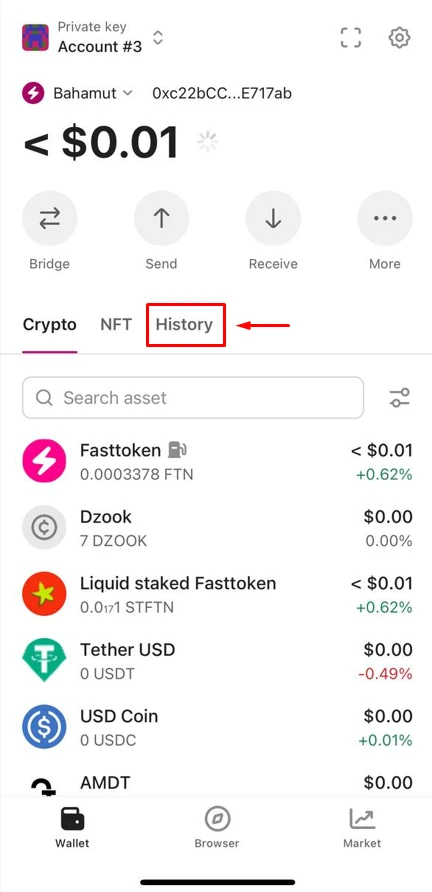 Tap the "History" tab. For detailed info, use a block explorer like ftnscan.com for Bahamut transactions.